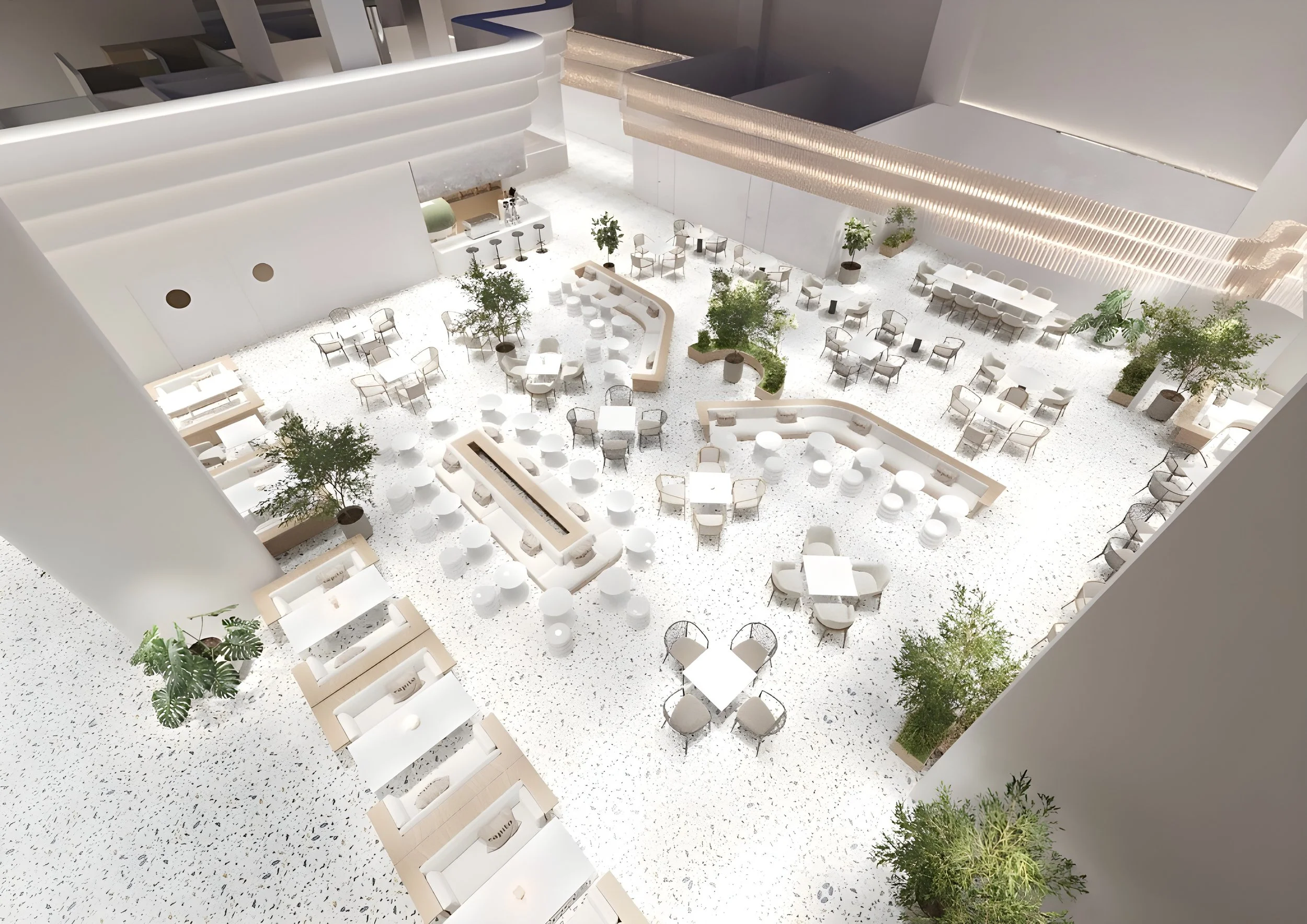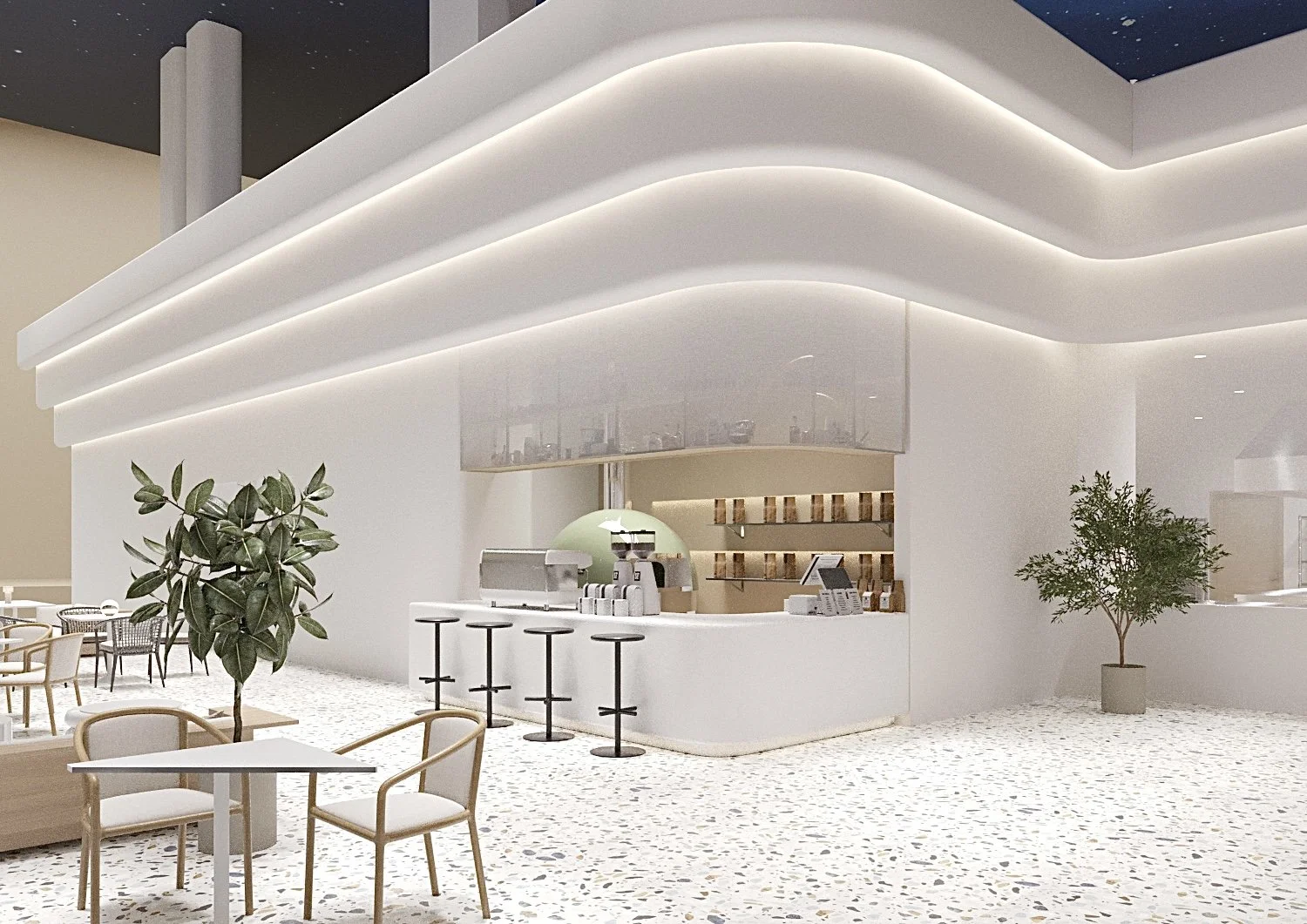 The main feature of the space is the unusual ceiling with an artistic pattern, which attracts attention and adds individuality. The interior creates an ideal atmosphere for breakfast, work and leisurely rest with a cup of coffee.